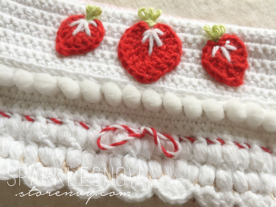 This is a pastel coloured crocheted tissue holder shaped like a cake with strawberry details.